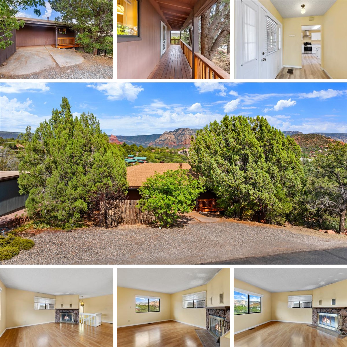 Welcome to this one of a kind Sedona home, ready for your personal touch! Two level home, 1296 square foot upstairs, 1296 square foot downstairs, offering flexibility, character and some fantastic Red Rock views! Upper level has open living space, kitchen, dining, living space, those fantastic views, a half bathroom, a wood burning fireplace and a large room previously used as a bedroom. This space is open and bright! Downstairs has two bedrooms, full bathroom, laundry space and workshop area with door to the outside lower level. Two downstairs bedrooms have sliding glass doors accessing a deck space. Home is being sold in an estate and is being sold as-is. Whether you're looking to renovate, invest, or simple enjoy the unique charm of Sedona, this property is a canvas for your vision!