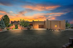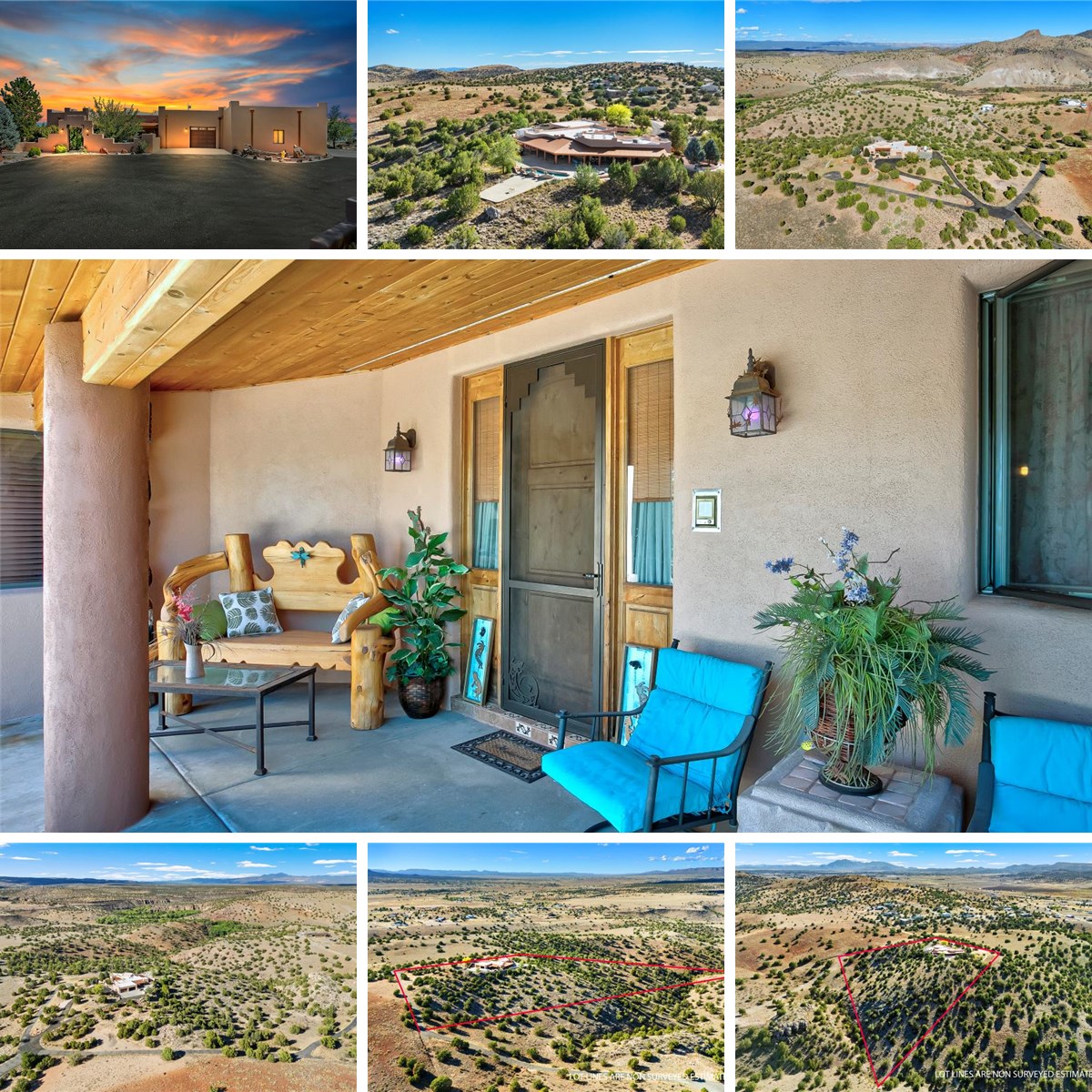 Privately positioned on 7.72 acres, this property enjoys all paved roads, underground utilities, and the serenity of wide-open space — all within a well-maintained private neighborhood. As you arrive, the home’s Santa Fe Architecture of a warm stucco exterior and sculpted lines frames the dramatic high-desert backdrop. Step inside to discover an inviting open layout where craftsmanship and artistry take center stage. The grand living room features a stone fireplace, built-in art alcoves, and high ceilings that enhance the sense of scale and light.